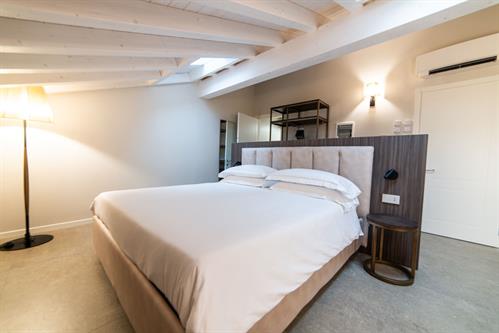 Camere accoglienti di 23 mq, caratterizzate da un design moderno e funzionale, con dettagli eleganti e sobrie linee contemporanee. Situate all'ultimo piano di un edificio storico, offrono un suggestivo sottotetto con travi in legno a vista. I bagni, rivestiti con materiali di pregio, sono dotati di docce ampie e confortevoli.
